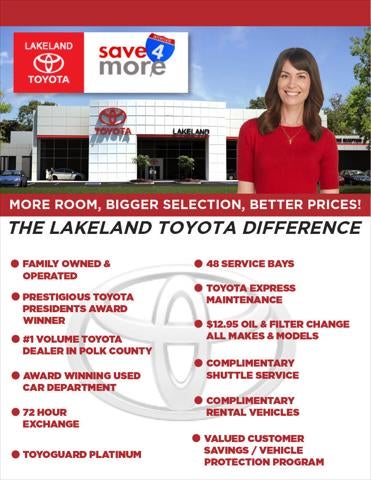 *Internet pricing on some vehicles includes Southeast Toyota rebates or Incentives. Lakeland Toyota Internet Price includes $1000 finance bonus cash only available for prime lender conventional financing through Lakeland Toyota, OAC (620+ score pulled by dealer) - some lender and term restrictions may apply. All prices are plus tax, title, license, $998 doc fee and reconditioning charge on pre-owned vehicles. Offer valid only on vehicles in stock at the time of purchase. Other restrictions may apply; second key, floor mats, and owner's manual may not be available on all pre-owned vehicles. Not responsible for typos