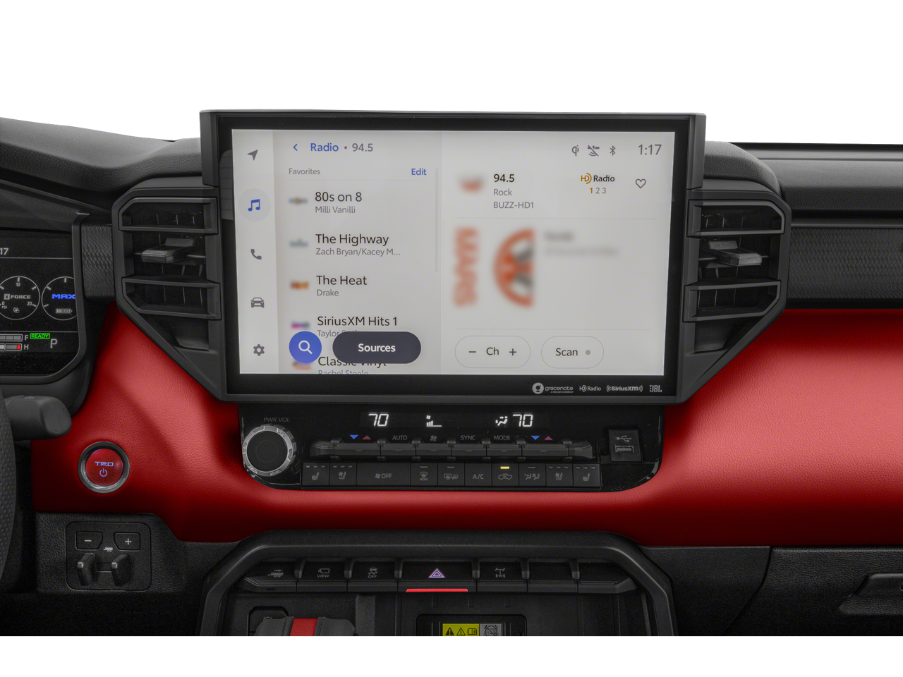 This vehicle comes equipped with: TRD Pro Package, 3.4L V6, 12 Speakers, 3.31 Axle Ratio, 4-Wheel Disc Brakes, ABS brakes, Air Conditioning, Alloy wheels, AM/FM radio: SiriusXM, Apple CarPlay/Android Auto, Auto High-beam Headlights, Auto-dimming door mirrors, Auto-dimming Rear-View mirror, Automatic temperature control, Brake assist, Bumpers: body-color, Delay-off headlights, Driver door bin, Driver vanity mirror, Dual front impact airbags, Dual front side impact airbags, Electronic Stability Control, Emergency communication system: Safety Connect (10-year trial), Exterior Parking Camera Rear, Front anti-roll bar, Front Bucket Seats, Front Center Armrest, Front dual zone A/C, Front fog lights, Front reading lights, Front wheel independent suspension, Fully automatic headlights, Garage door transmitter: HomeLink, Heated & Ventilated Front Bucket Seats, Heated door mirrors, Heated front seats, Heated steering wheel, Illuminated entry, Knee airbag, Leather Shift Knob, Low tire pressure warning, Memory seat, Navigation System, Occupant sensing airbag, Outside temperature display, Overhead airbag, Overhead console, Panic alarm, Passenger door bin, Passenger vanity mirror, Power door mirrors, Power driver seat, Power moonroof, Power passenger seat, Power steering, Power windows, Radio data system, Radio: Premium Audio w/JBL, Rear reading lights, Rear seat center armrest, Rear step bumper, Rear window defroster, Remote keyless entry, Security system, SofTex Seat Trim, Speed control, Speed-sensing steering, Split folding rear seat, Sport steering wheel, Steering wheel mounted audio controls, Tachometer, Telescoping steering wheel, Tilt steering wheel, Traction control, Trip computer, Turn signal indicator mirrors, Variably intermittent wipers, Ventilated front seats, Voltmeter, and Wheels: 18 x 8 Black BBS Forged Aluminum.