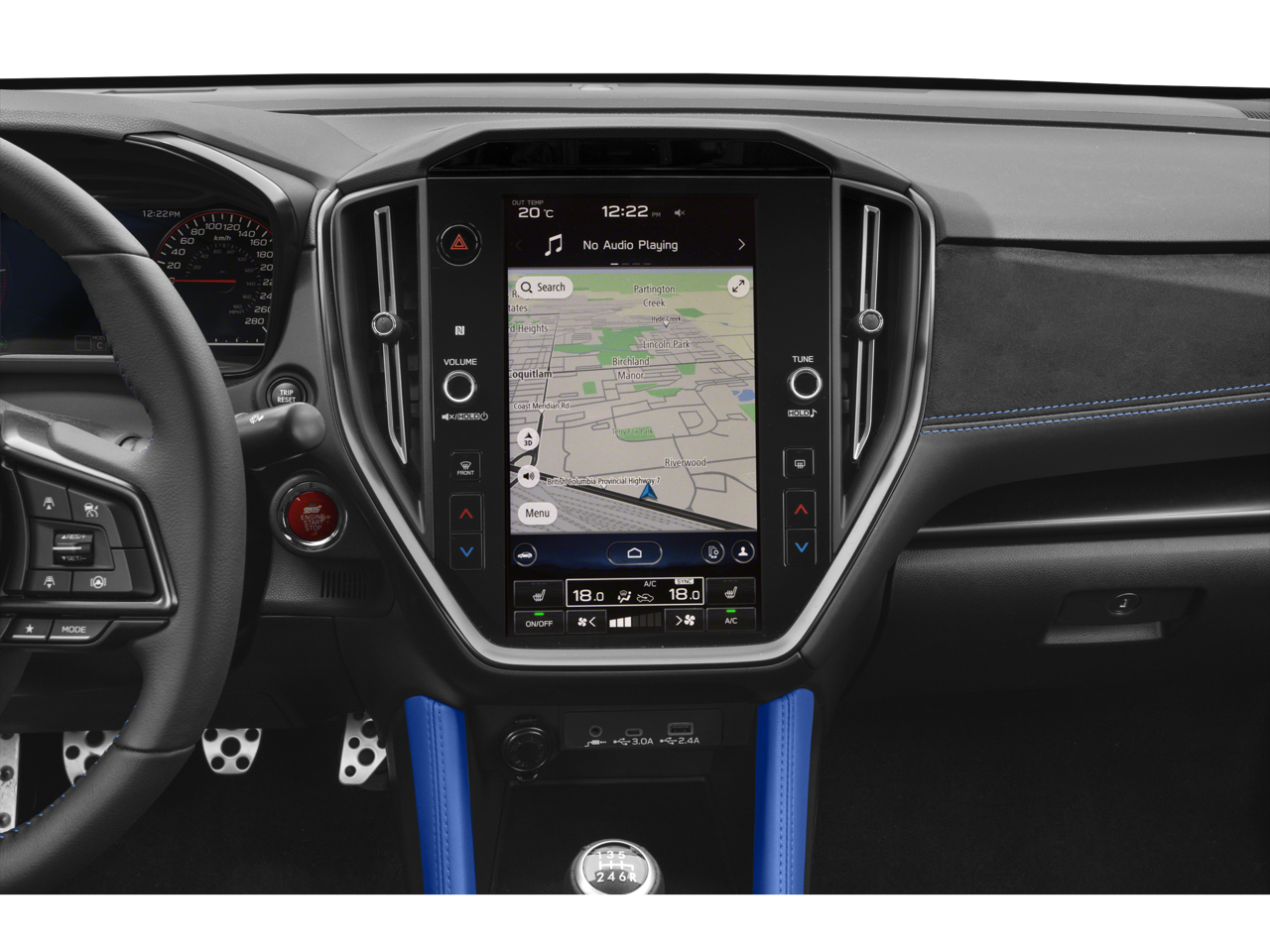 This vehicle comes equipped with: 11 Speakers, 4-Wheel Disc Brakes, ABS brakes, Air Conditioning, Alloy wheels, AM/FM radio: SiriusXM, Auto High-beam Headlights, Automatic temperature control, Brake assist, Bumpers: body-color, Driver door bin, Driver vanity mirror, Dual front impact airbags, Dual front side impact airbags, Electronic Stability Control, Emergency communication system, Exterior Parking Camera Rear, Four wheel independent suspension, Front anti-roll bar, Front Bucket Seats, Front Center Armrest, Front dual zone A/C, Front fog lights, Front reading lights, Fully automatic headlights, harman/kardon® Speakers, Heated door mirrors, Heated front seats, Illuminated entry, Knee airbag, Leather Shift Knob, Leather steering wheel, Low tire pressure warning, Navigation System, Occupant sensing airbag, Outside temperature display, Overhead airbag, Overhead console, Panic alarm, Passenger door bin, Passenger vanity mirror, Performance Design Recaro Heated Frt Bucket Seats, Power door mirrors, Power driver seat, Power steering, Power windows, Radio data system, Radio: Subaru 11.6 Multimedia System w/Navigation, Rear anti-roll bar, Rear seat center armrest, Rear window defroster, Remote keyless entry, Security system, Speed control, Speed-sensing steering, Split folding rear seat, Spoiler, Sport steering wheel, Steering wheel mounted audio controls, Tachometer, Telescoping steering wheel, Tilt steering wheel, Traction control, Trip computer, Turn signal indicator mirrors, Ultrasuede & Leather-Trimmed Seats w/Blue Bolsters, Variably intermittent wipers, and Wheels: 19 x 8.5 Satin Gray Finish Alum Alloy.
