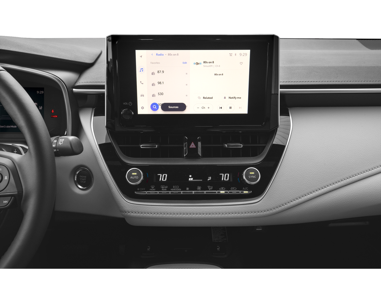 This Vehicle is nicely equipped with the following features: 4-Wheel Disc Brakes, 8 Speakers, ABS brakes, Air Conditioning, Alloy wheels, AM/FM radio: SiriusXM, Auto High-beam Headlights, Automatic temperature control, Brake assist, Bumpers: body-color, Compass, Delay-off headlights, Driver door bin, Driver vanity mirror, Dual front impact airbags, Dual front side impact airbags, Electronic Stability Control, Emergency communication system: Safety Connect (up to 10-year trial subscription), Exterior Parking Camera Rear, Four wheel independent suspension, Front anti-roll bar, Front Bucket Seats, Front Center Armrest, Front dual zone A/C, Front fog lights, Front reading lights, Heated door mirrors, Heated front seats, Heated Sport Front Seats, Illuminated entry, Knee airbag, Leather Shift Knob, Leather steering wheel, Low tire pressure warning, Occupant sensing airbag, Outside temperature display, Overhead airbag, Overhead console, Panic alarm, Passenger door bin, Passenger vanity mirror, Power door mirrors, Power driver seat, Power steering, Power windows, Radio data system, Radio: 8 Toyota Audio Multimedia, Rear anti-roll bar, Rear seat center armrest, Rear side impact airbag, Rear window defroster, Rear window wiper, Remote keyless entry, Security system, SofTex Seat Trim with Fabric Inserts, Speed control, Speed-sensing steering, Split folding rear seat, Spoiler, Steering wheel mounted audio controls, Tachometer, Telescoping steering wheel, Tilt steering wheel, Traction control, Trip computer, Turn signal indicator mirrors, Variably intermittent wipers, and Wheels: 18 Graphite-Colored Alloy.